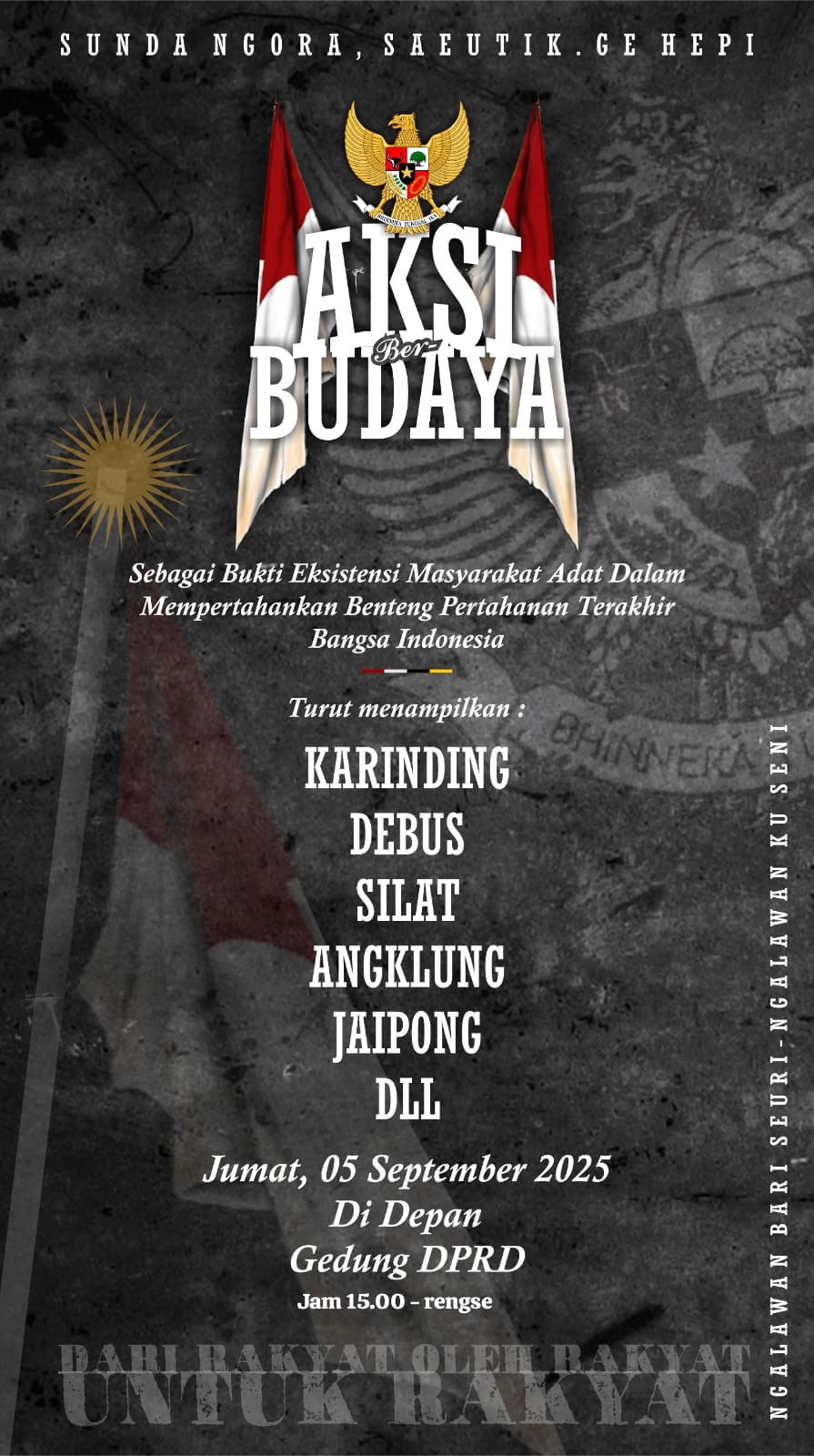 Dalam aksi ini akan ditampilkan beragam kesenian tradisi, seperti karinding, debus, silat, angklung, jaipong, dan pertunjukan lainnya. Para pelaku seni menegaskan bahwa aksi massa tidak selalu identik dengan kerusuhan atau anarkisme. Sebaliknya, kritik bisa disampaikan melalui ruang kebudayaan.