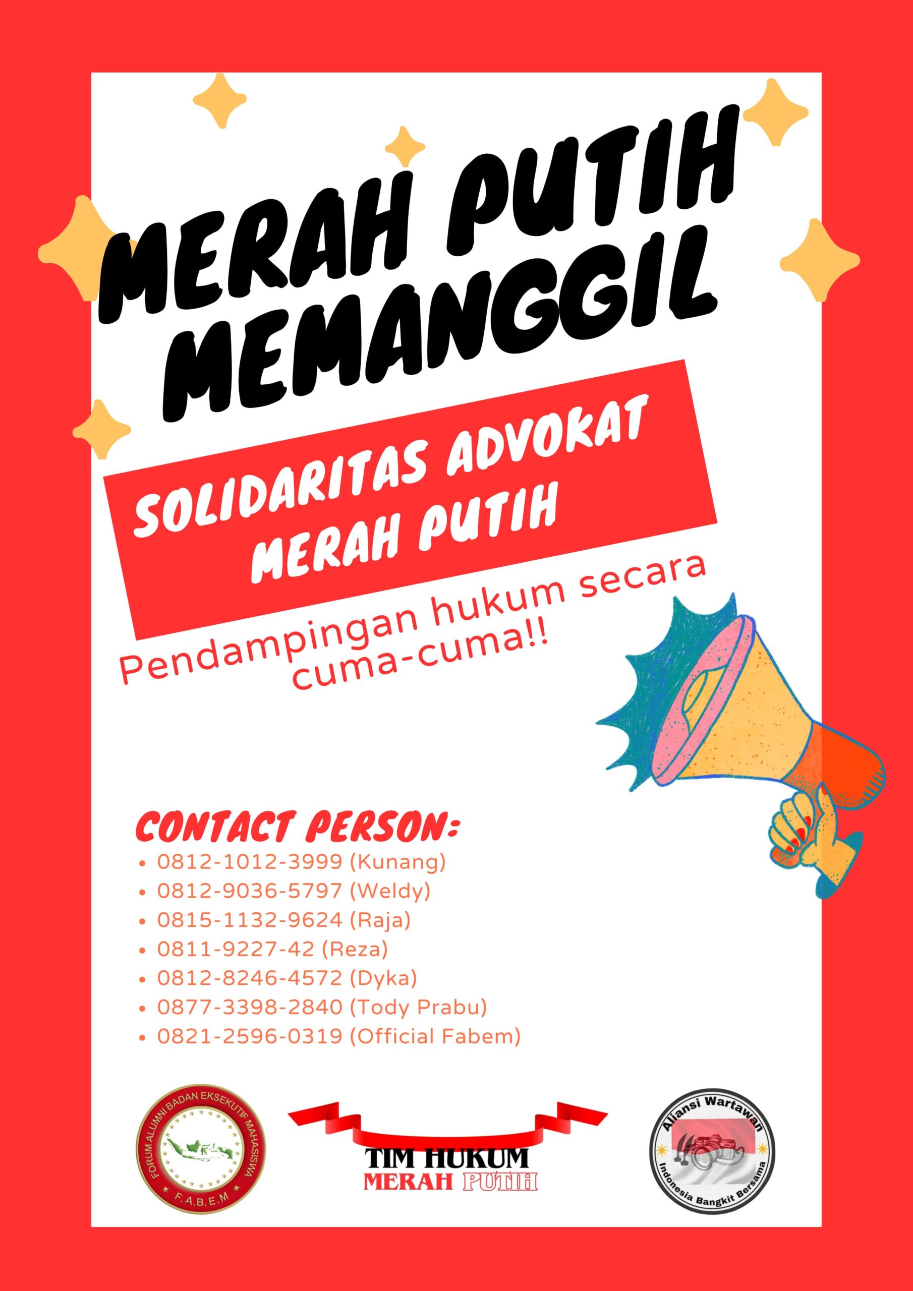 Masyarakat yang membutuhkan bantuan hukum dapat langsung menghubungi narahubung resmi Tim Advokasi Merah Putih: