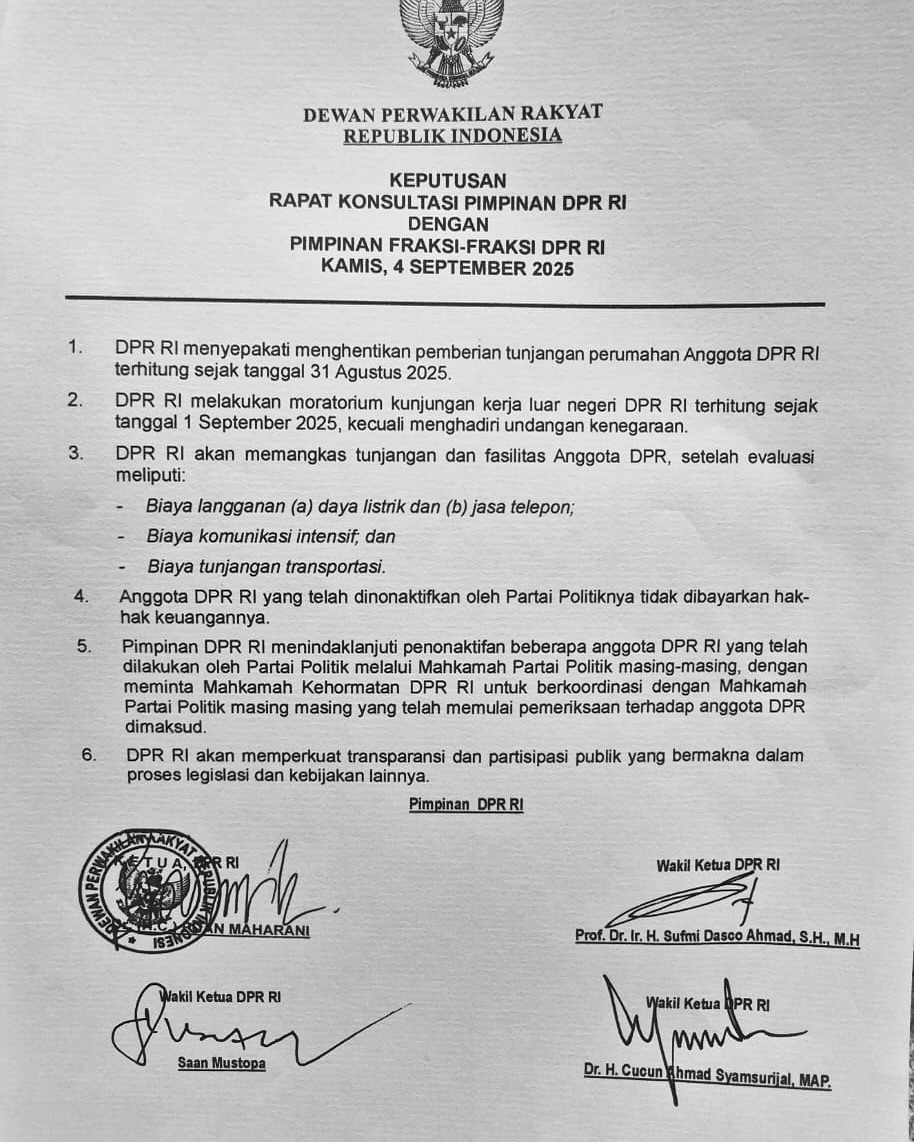 Keputusan tersebut menetapkan beberapa poin penting, di antaranya penghentian pemberian tunjangan perumahan bagi Anggota DPR RI terhitung sejak 31 Agustus 2025. Selain itu, DPR RI juga memberlakukan moratorium kunjungan kerja ke luar negeri bagi seluruh anggota mulai 1 September 2025, kecuali jika menghadiri undangan resmi kenegaraan.