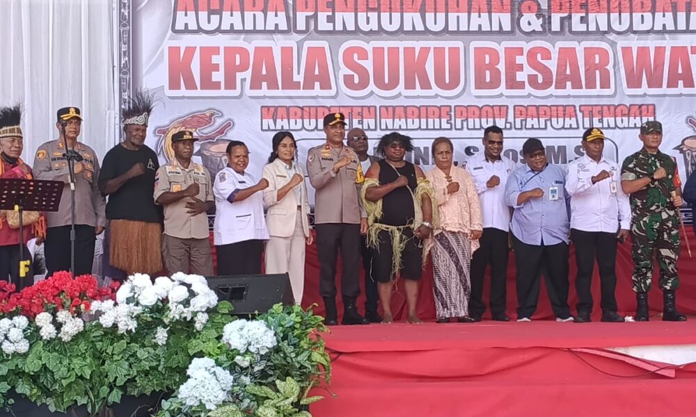 Porosmedia.com, Nabire, Papua Tengah – Penobatan Kepala Suku Besar Wate di Taman Gizi Oyehe Nabire berlangsung khidmat dan penuh pesan persatuan. Dua tokoh penting menghadiri dan memberikan sambutan, yakni Kapolda Papua Tengah Brigjen Pol. Alfred Papare dan Asisten III Setda Papua Tengah yang mewakili Gubernur Papua Tengah. Keduanya menyoroti pentingnya menjaga keharmonisan adat, keamanan wilayah, serta memperkuat integrasi sosial di Papua Tengah.