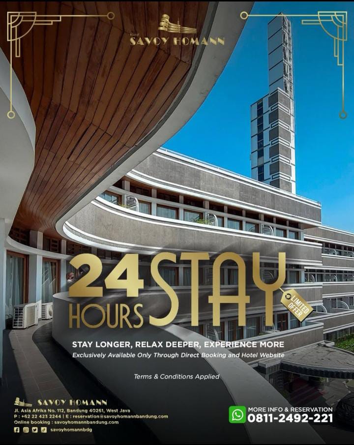 “Kami memahami bahwa setiap tamu memiliki kebutuhan waktu yang berbeda. Melalui promo 24 Hours Stay, kami ingin memberikan kebebasan dan fleksibilitas lebih, sehingga tamu dapat menikmati pengalaman menginap tanpa dibatasi waktu,” ujar perwakilan manajemen Hotel Savoy Homann Bandung.