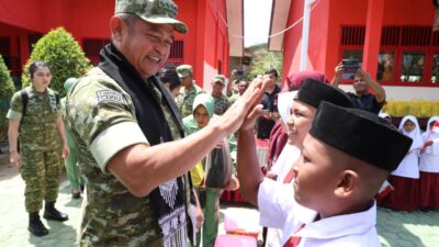 Usai peresmian, Kasad yang didampingi Ketua Umum Persit Kartika Chandra Kirana Ny. Uli Simanjuntak meninjau sekolah yang telah dibersihkan dan kembali digunakan untuk kegiatan belajar mengajar, serta menyerahkan bantuan sosial kepada masyarakat setempat. *(Dispenad)*
