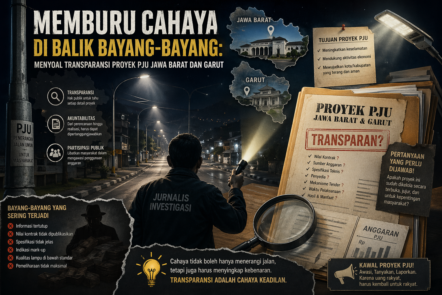 Porosmedia.com – Jalanan yang gelap bukan sekadar soal keterbatasan penglihatan, melainkan cermin dari efektivitas tata kelola infrastruktur. Belakangan ini, sorotan tajam mengarah pada proyek Alat Penerangan Jalan Umum (APJU/PJU) di bawah naungan Dinas Perhubungan (Dishub) Provinsi Jawa Barat dan unit-unit kerjanya di daerah, termasuk wilayah Kabupaten Garut. Bukan karena prestasinya yang menerangi pelosok desa, melainkan karena aroma tak sedap yang mulai terendus ke permukaan.