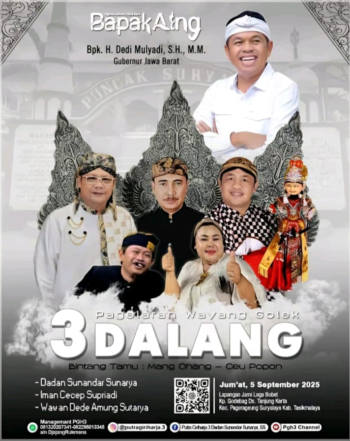 Porosmedia.com, Tasikmalaya – Seni budaya Sunda kembali mendapat ruang apresiasi melalui gelaran Pagelaran Wayang Golek 3 Dalang yang akan dilaksanakan pada Jumat, 5 September 2025, bertempat di Lapangan Jami Laga Bobot, Kampung Godebag, Desa Tanjung Kerta, Kecamatan Pagerageung, Kabupaten Tasikmalaya.