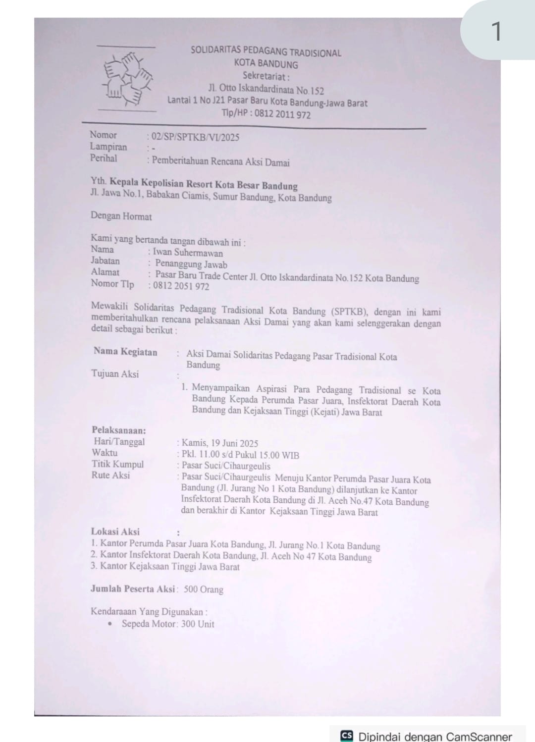 Berdasarkan surat pemberitahuan resmi bernomor 02/SP-SPTKB/V/2025, aksi ini akan melibatkan sekitar 500 pedagang yang akan melakukan long march dari Pasar Suci Cihaurgeulis menuju tiga titik sentral kekuasaan: Kantor Perumda Pasar Juara, Inspektorat Daerah Kota Bandung, dan Kejaksaan Tinggi Jawa Barat (Kejati Jabar).