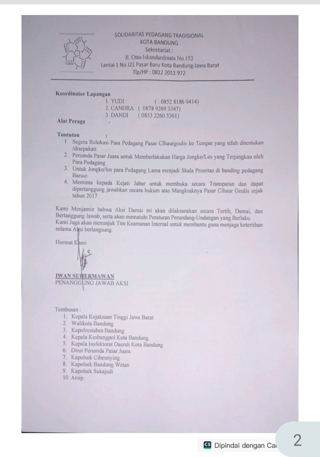 Dalam pernyataannya, Iwan Suhermawan, penanggung jawab aksi, menegaskan bahwa persoalan utama adalah ketidakjelasan nasib para pedagang Pasar Cihaurgeulis. Sejak pasar tersebut mangkrak sejak 2017, ratusan pedagang terdampak kehilangan tempat usaha dan pendapatan. Ironisnya, pembangunan kembali pasar itu telah memakan waktu bertahun-tahun namun tak kunjung tuntas.