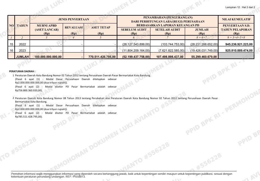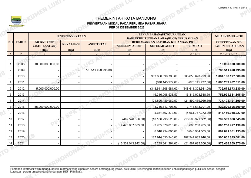 Porosmedia.com, Bandung – Data resmi penyertaan modal Pemerintah Kota Bandung pada Perusahaan Umum Daerah (Perumda) Pasar Juara menunjukkan angka yang sangat signifikan, namun dibayangi oleh fluktuasi laba-rugi yang tajam dari tahun ke tahun. Berdasarkan dokumen hingga 31 Desember 2023, nilai kumulatif penyertaan modal mencapai Rp 925,81 miliar (2023) hingga Rp 945,23 miliar (2022), dengan total historis sejak 2008 tercatat di kisaran Rp 1 triliun.