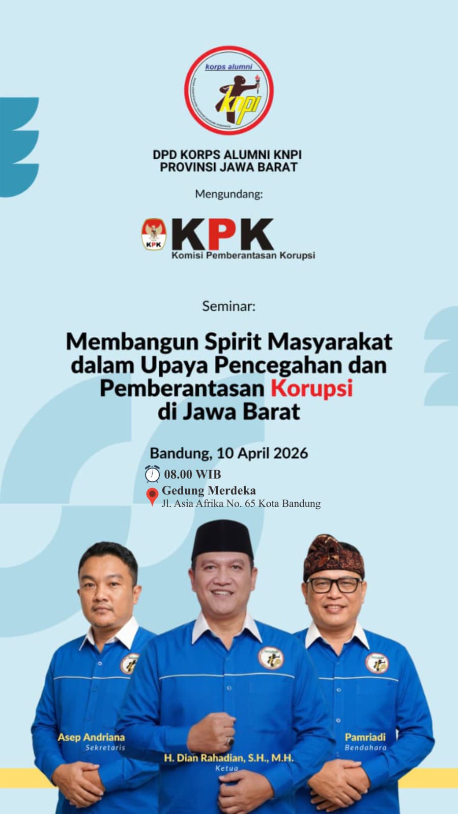 Kegiatan yang bertajuk “Membangun Spirit Masyarakat dalam Upaya Pencegahan dan Pemberantasan Korupsi di Jawa Barat” ini diselenggarakan pada Jumat (10/4/2026), bertempat di lokasi bersejarah, Gedung Merdeka, Jalan Asia Afrika, Kota Bandung.