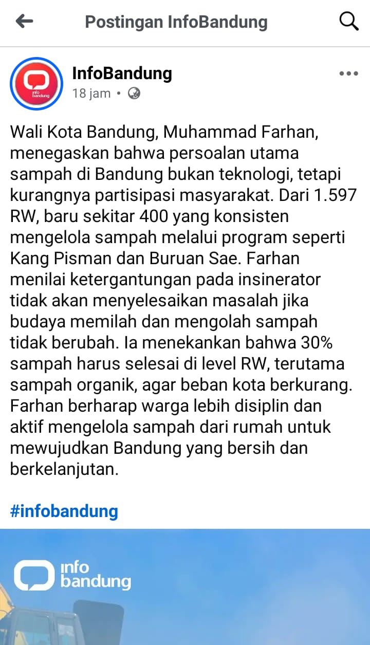Dalam pernyataannya, Farhan menilai bahwa dari 1.597 RW di Kota Bandung, baru sekitar 400 RW yang konsisten menjalankan pengelolaan sampah berbasis lingkungan seperti Kang Pisman dan Buruan Sae. Ia menegaskan bahwa beban Kota Bandung akan berkurang apabila 30% sampah dapat terselesaikan di tingkat RW, khususnya sampah organik.