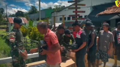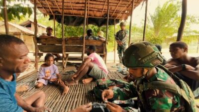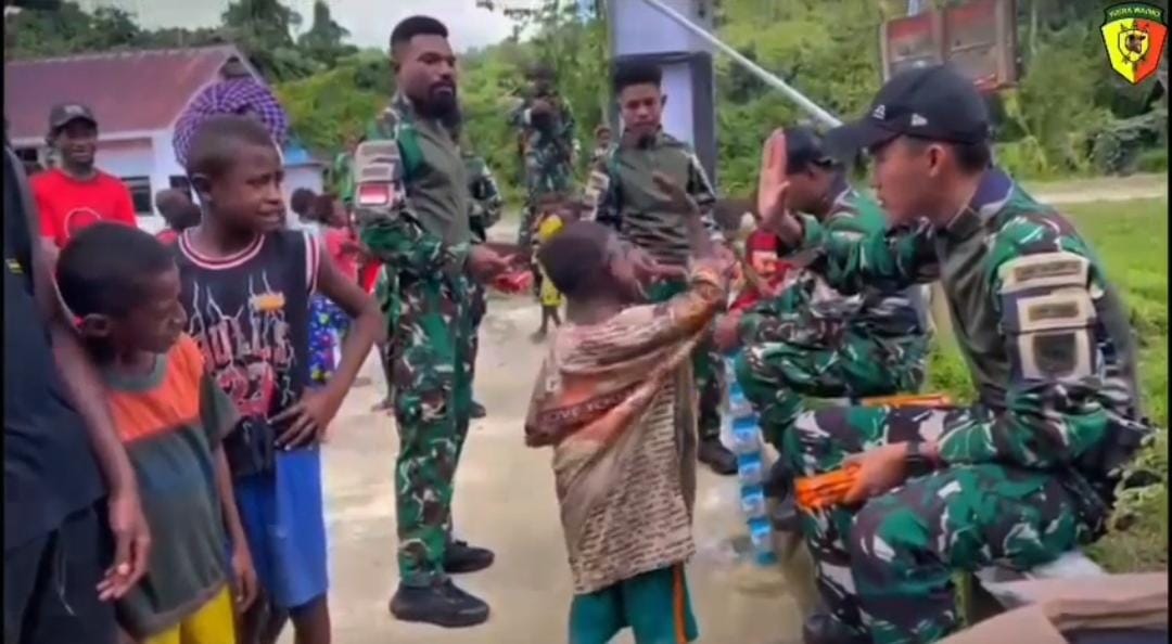 Tambrauw, Papua Barat Daya Dalam rangka mempererat hubungan antar masyarakat terutama anak anak, Satgas Pamtas RI-PNG Kewilayahan Yonif 763/SBA Pos Yembun melaksanakan kegiatan pembagian makanan yaitu berupa snack dan makanan lainnya kepada masyarakat