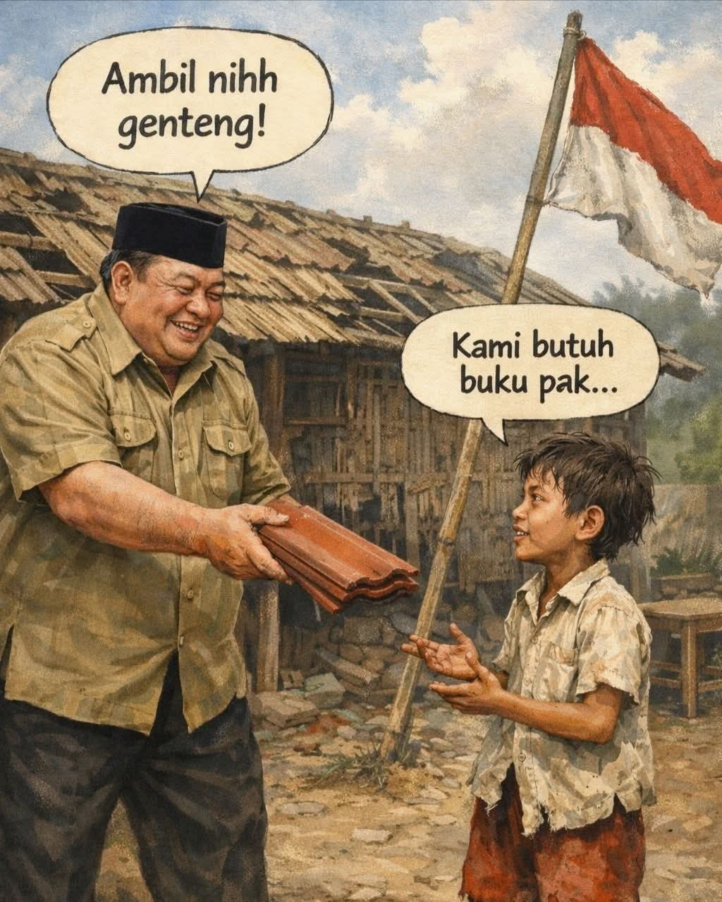 Tentu genteng bukan musuh; berteduh itu kebutuhan dasar. Namun ada hal-hal yang jauh lebih genting: sekolah yang kokoh, buku yang cukup, pakaian yang menjaga percaya diri, dan layanan kesehatan yang tidak membuat orang takut jatuh sakit. Jangan sampai kita terlalu sibuk memperindah yang terlihat hingga terlambat memperbaiki yang terasa. Karena sebuah bangsa tidak goyah oleh atap yang sederhana, melainkan oleh fondasi yang lama diabaikan.