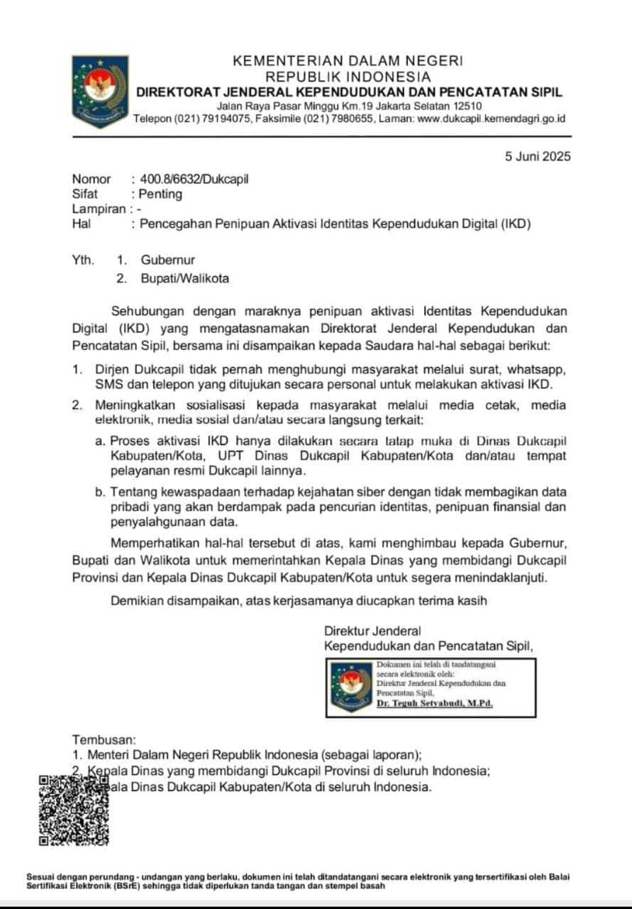 Dalam surat tertanggal 5 Juni 2025 tersebut, Dirjen Dukcapil Dr. Teguh Setyabudi, M.Pd., menegaskan bahwa pihaknya tidak pernah menghubungi masyarakat secara personal melalui surat, WhatsApp, SMS, atau telepon untuk melakukan aktivasi IKD.